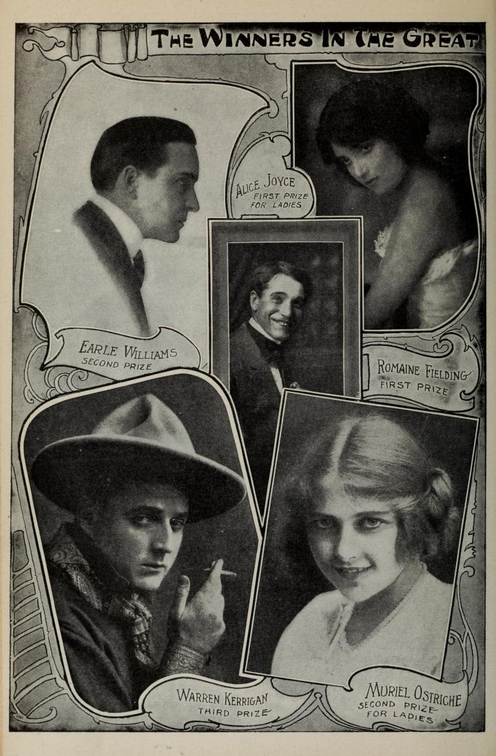 Further, top winners Romain Fielding and Alice Joyce would both receive a “handsome wardrobe-trunk that is valued at $150, and the contents are priceless, because they include immense bundles of verses and prose appreciations, together with the most exquisitely bound set of Motion Picture books, pictures, essays and treatises in existence.”