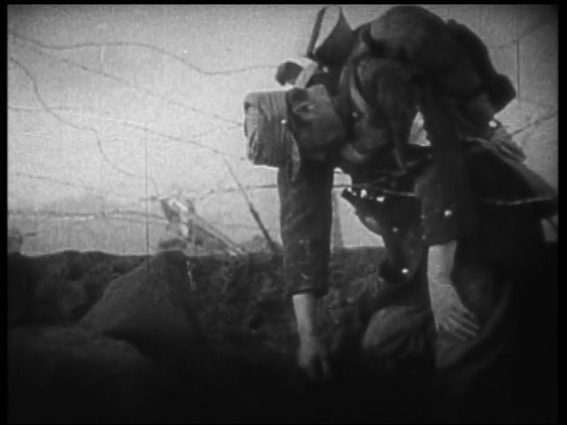 Barbed Wire is not really about tactics and strategy so the war scenes are a series of vignettes showing the smoke, wire, shells and explosions. The film concerns itself with creating atmosphere and showing the aftermath of a skirmish. In the midst of the war, a wounded Andre manages to befriend a German soldier. Back at the farm, Mona and her father receive a letter saying that Andre was killed in action. Mona’s father collapses and begins to curse the Germans.