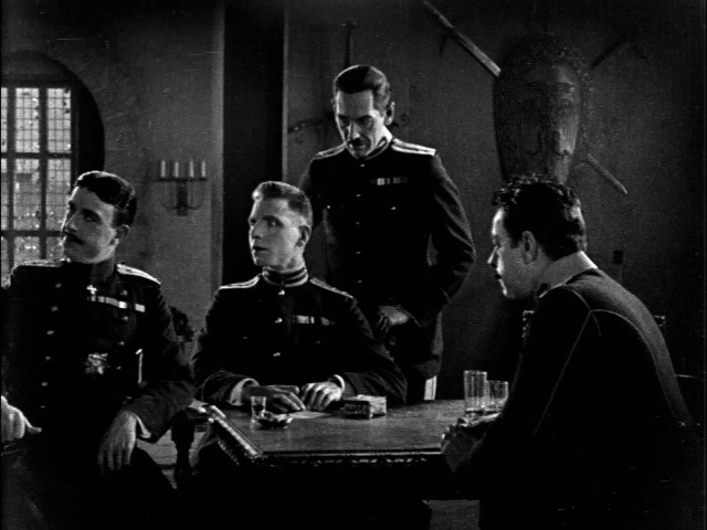 Meanwhile, Rudolf is taking a nap in the forest of Zenda, Duke Michael’s backyard, when he is awoken by Colonel Sapt (Robert Edeson) and Captain Fritz von Tarlenheim (Malcolm McGregor), the two closest allies of the King. They are astonished by the resemblance between Rudolf and their monarch. The King is tickled to meet his double and immediately invites Rudolf to a late-night drinking party.