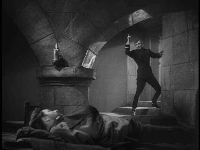 Michael has his brother imprisoned in the dungeon of the castle of Zenda. Antoinette has filled him on on Rudolf’s identity. However, he cannot act. If he kills his brother, he will still not have the throne. He must kill Rudolf first, then he may dispose of his brother whenever he wishes. Antoinette balks at all this talk of violence. She asks to look in on the prisoner of Zenda. The King was wounded during his abduction and he is dying by inches due to rough treatment and the cold of the dungeon. Antoinette decides to act.