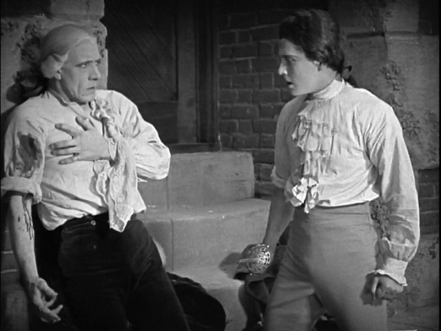 Here is the set-up: Andre has the Marquis exactly where he wants him, pinned to the wall. But he cannot bring himself to run him through. Why? Andre wonders this loudly. Then Lewis Stone’s character comes up and helpfully says that the Marquis is really Andre’s brother.