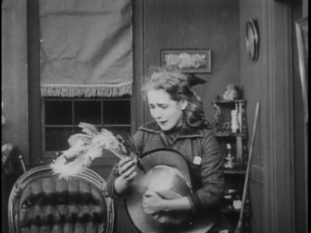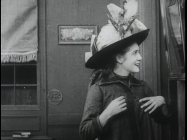 Griffith’s skill as a director and Pickford’s talent as a performer are displayed marvelously in the scene where Mary has fallen asleep after seeing the New York hat, written in the scenario as merely “Mary at home is dreaming of the marvels of the wonderful hat.” The film plays this up for maximum pathos. In her sleep, Mary Pickford reaches up, feels the imaginary brim and smiles, knowing her hat has made her a beauty. When she wakes up, she repeats the gesture but disappointment clouds her face when she realizes it was all a dream. This sweet scene makes Mary’s social rejection all the more heartbreaking.