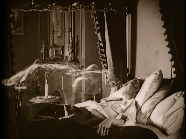 There is one exception, though. Near the end of the film, when Hyde has begun to manifest himself without the formula, Dr. Jekyll is sleeping fitfully. Then an apparition of Hyde appears in the form of a giant spider. The spider crawls onto the fainting Jekyll and disappears into him. Jekyll then transforms into Hyde. It is a marvelously creepy touch handled very well by Robertson and cinematographer Roy Overbaugh.