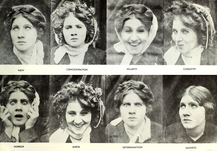 To give the images context, I should note that in the early years of motion pictures, performers would indeed have samples of their assorted emotions printed to demonstrate their range. Here are some from Florence Lawrence, widely considered the first true movie star: