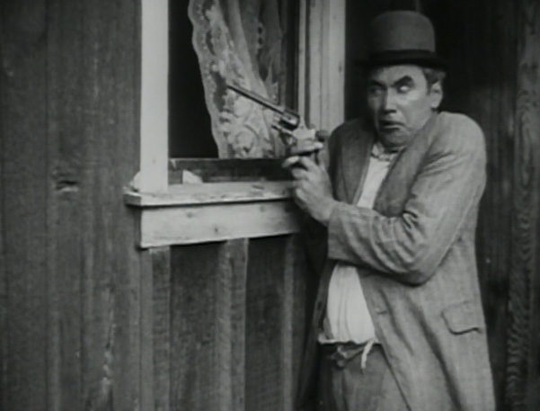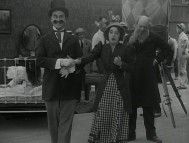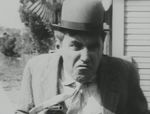 Mack tries to forget his troubles at the movie theater. Imagine his surprise when he sees Mabel in the lead! And she is being attacked by the villainous Ford Sterling! No one can do that to Mabel and live! Mack arms himself and prepares to do away with the foul cur. (Sennett approaches the camera with a glower. A rib on the famous closeup in The Musketeers of Pig Alley?)