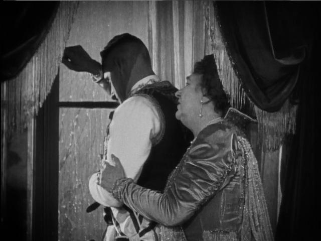 Danilo and Mirko take the opportunity to sneak into Sally’s dressing room in hopes of winning her over. Danilo gets there first, teases Mirko into retreating and then falls asleep on Sally’s bed using her negligee as a pillow. Sally is annoyed by this at first but soon agrees to dinner at his club.