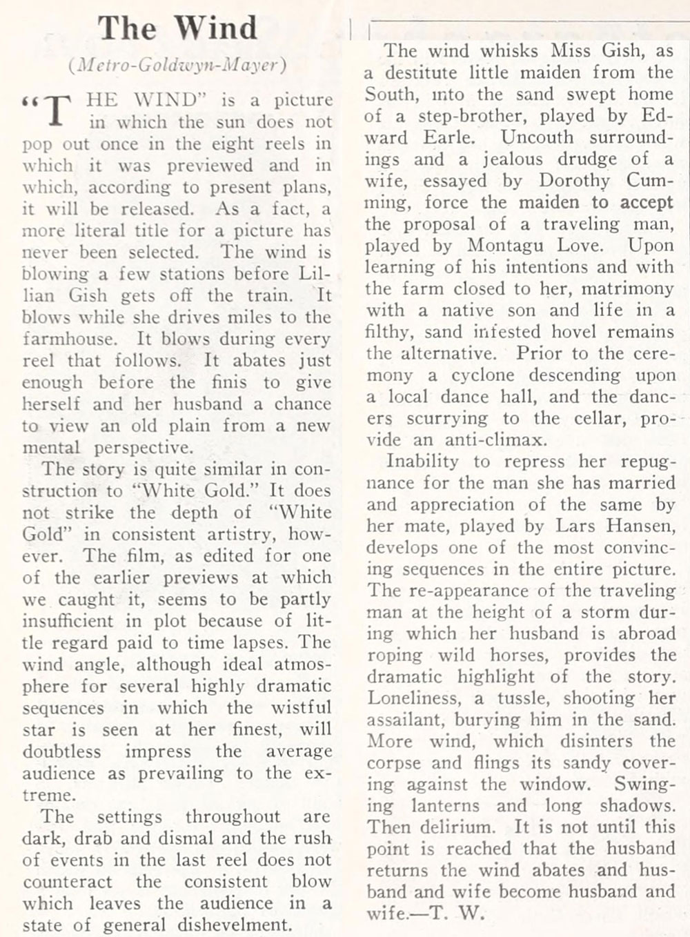 Quite the opposite! The Wind was indeed released to critics in late 1927, a full year before its general release in late 1928, but reviews in two film periodicals do not support the idea of a tragic ending in this cut of the picture.