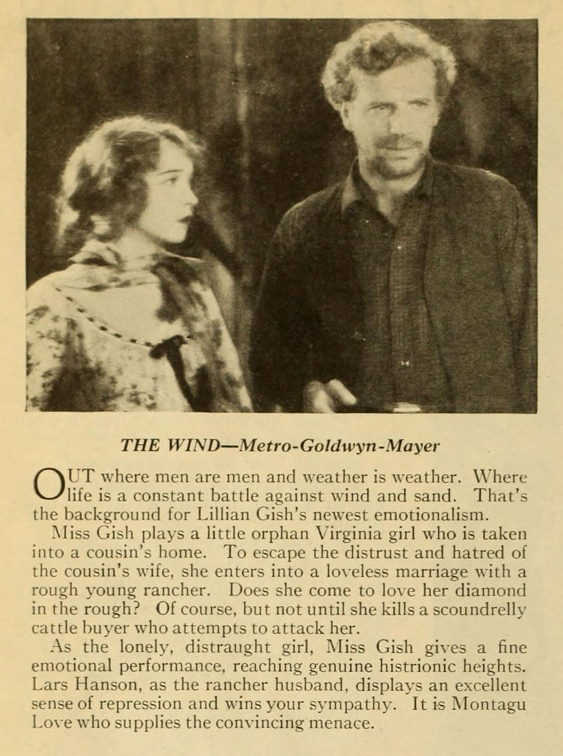 I should mention, though, that MGM did have major reservations about The Wind. They shelved it for an entire year and then dumped it in late 1928, when talkies were an unstoppable force.