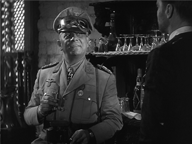 The Germans arrive on cue. Bramble slips away and hides in the employees-only section of the hotel. Mouche, meanwhile, has set about flirting with Lieutenant Schwegler (Peter van Eyck), who is the victorious Field Marshall Rommel’s adjutant.
