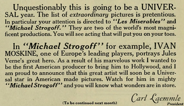 (Some anecdotes about Mosjoukine’s importation include Laemmle hiring him sight unseen because of hearing he was described as the Valentino of Europe. I have been unable to unearth any first-hand accounts of this. As stated before, it’s pretty clear that Laemmle based his hiring on Michael Strogoff. I am always extremely cautious of “too funny/inept to be true” anecdotes as they almost always prove to be myths. However, it is possible that Laemmle used the “Valentino of Europe” description to make his case for hiring Mosjoukine or that it was mentioned in passing during negotiations, I just do not believe it was his only reason.)
