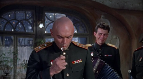 Speaking of stupid, why did no one report Brynner for his strange detention (at state expense) of a large party of civilians? Does he do this often? If I were a Soviet poobah, I would certainly object to state funds being used this way. Stuffed cabbage is not free! (That is pretty much all everyone eats in this picture. That’s all well and good but wouldn’t that get a tad… aromatic? Especially in such close quarters?)