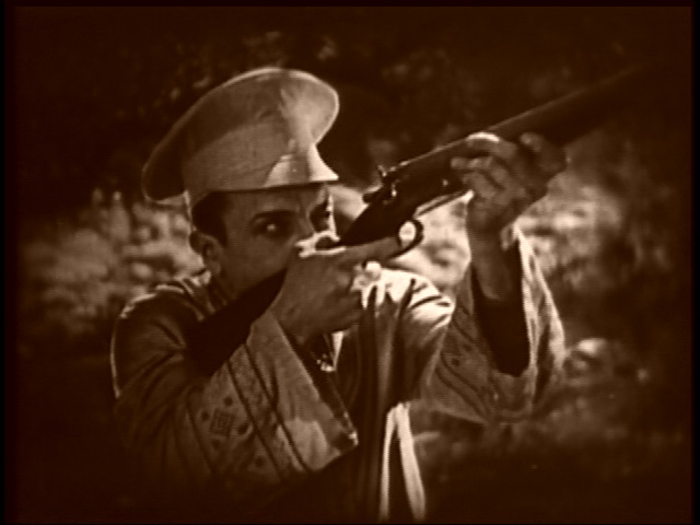 On the plus side, the film has atmosphere to spare, a rare setting for silent cinema and it boasts of some rather attractive camera work. There is a particularly impressive scene at the beginning of the film where the camera swoops along the point of view of Mosjoukine’s rifle sights.