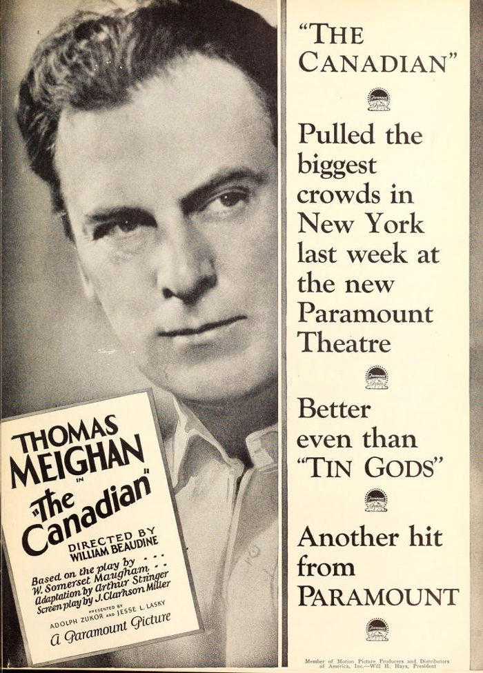 The Canadian was based on a 1913 four-act play entitled The Land of Promise by W. Somerset Maugham. (You can read a free public domain version here.) It was adapted into a novel in 1914 by D. Torbett. (And you can read a free version of that here.) And then made into a motion picture in 1917, starring Thomas Meighan and Billie “Good Witch” Burke. (That version is missing and presumed lost. It was not unusual for movie studios to destroy the original when a new version was scheduled for release.) Remake fever is not a new condition. In fact, silent Hollywood had the worst case to date. Paramount decided to showcase the popular Meighan in the Maugham tale one more time and the result was The Canadian.
