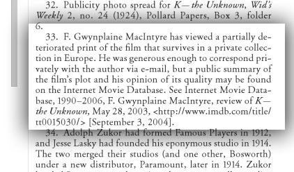 Again, I would not get worked up about MacIntyre’s hobby if it did not cause so much damage. Newcomers to silent film are invariably confused when they see detailed reviews of films purported to be lost. Authors and researchers may repeat his errors. It has caused something of a headache for the rest of us.