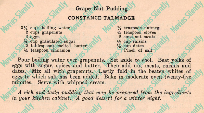I saw Connie in “East Is West” a few weeks ago and was enthralled; like Colleen Moore, her skill at romantic comedy (a silent-era genre that tends to be overlooked) deserves further investigation. As for the recipe…it has potential (unlike you, I enjoy Grape-Nuts), but I’d probably make my version without raisins, which are only good with bran or eaten out of a Sun-Maid box.