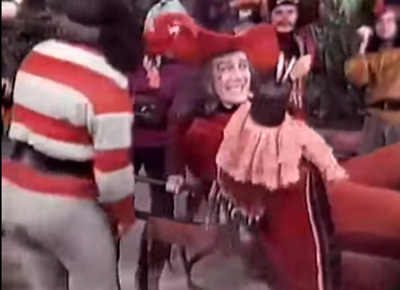 Ah, Captain Hook at last! Hood was starchy and neurotic in the original play and book but Cyril Ritchard hams the role up in spectacular manner. His Hook is gleefully homicidal and has a tendency to randomly perform Latin American and European ballroom dances. I can think of no better way for a villain to behave.
