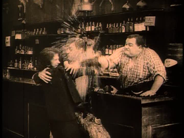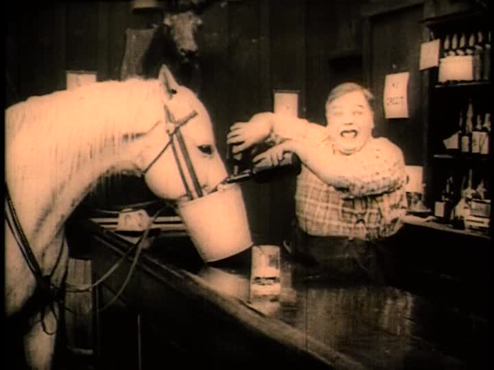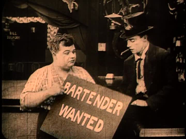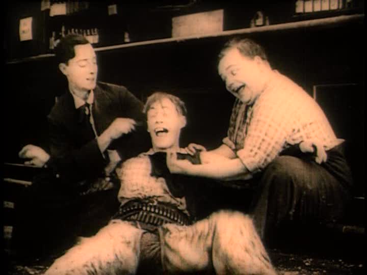 Arbuckle gets a job in Keaton’s saloon, which is soon attacked by Al St. John’s bandit character. St. John is impervious to bottle broken over his head, bullets in the back, everything except tickling. Chaos ensues.