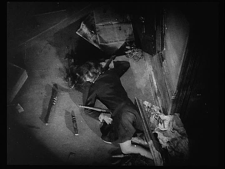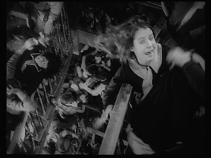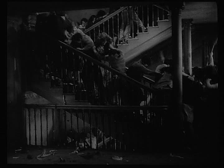 In the melee, the goofy Bozo (Eddie Quillan) gets shoved into an atheist girl trapped on the staircase. The bannister breaks and she plummets seven floors.