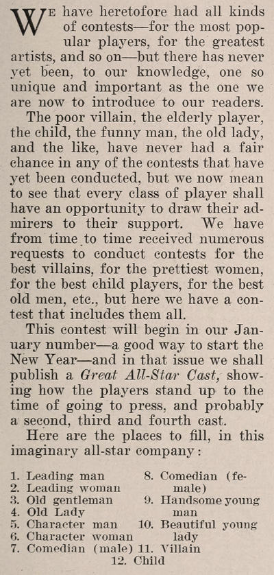 Who were the most popular stars a century ago? Once again, Motion Picture Magazine gives us a clue. In 1913 and 1914, they held popularity contests to discover the top stars in the eyes of their readers. In 1915, the magazine did things a little differently. They held the Great Cast Contest. Readers could vote for performers in various categories instead of voting for everyone in a huge lump.