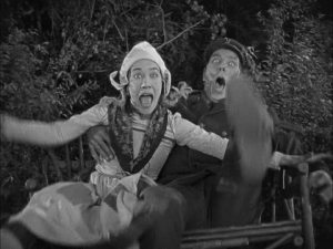 The plot meanders and feels padded out with tedious slapstick. Comedy requires internal logic in order to succeed but the jokes in The Red Mill are crammed in with little thought as to why such a setup would exist. For example, Tina gets locked in a haunted mill during a storm. There are loud noises but they turn out to be bowling balls tumbling down the stairs. Um, why is anyone storing bowling balls at the top of a haunted mill? Or stuffed coyotes? And whose skeleton is that?