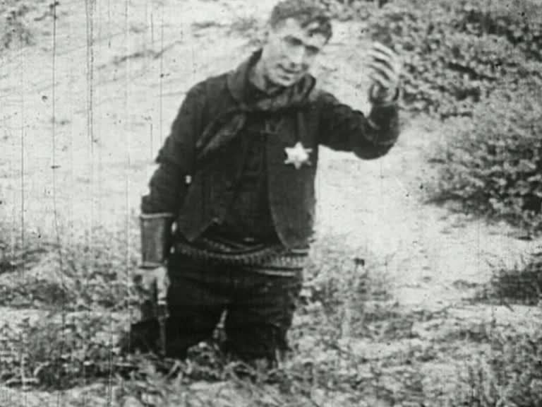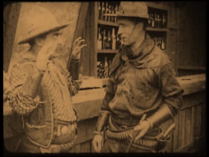 As you will see, the British Pathé Baby release is consistently closer to the original story. The U.S.A. Pathex release takes the footage and completely reworks it, removing the antihero angle wherever possible, likely to make it more suitable for family viewing. (The western genre was well on its way to being infantilized by the time these home releases were sold in the late twenties or early thirties.)