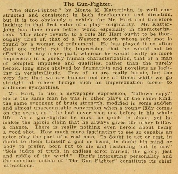 A quick reminder is in order. William S. Hart’s westerns were usually violent and almost always featured ruthless villainy or near-villainy from the leading man. His dark breed of western fell out of style by the twenties and was not truly revived for nearly half a century.