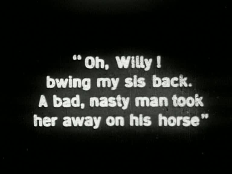 Baby Talk: Jimmy is about five years old and his title cards vary drastically between versions. When the baddie kidnaps Norma, Jimmy runs to William S. Hart’s character for help. The original film opted for the simple and poignant “I want my sister back.”