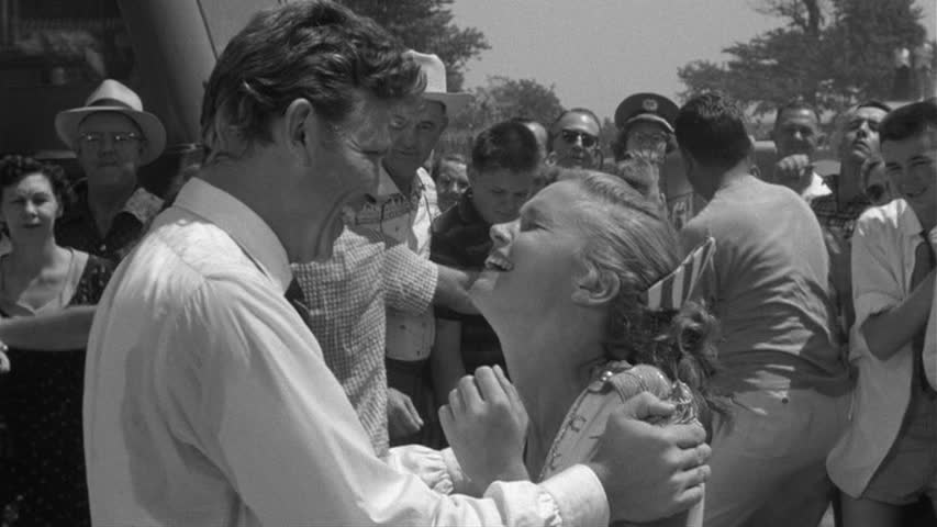 The story opens with Marcia (Patricia Neal), a bubbly reporter who hosts a small town radio show called A Face in the Crowd. She has the swell idea of interviewing a low-level offender at the local jail and a fellow named Rhodes (Griffith) seems to fill the bill. After he refuses to give his real name, she dubs him “Lonesome” and records him singing, bantering and generally charming everyone with his country ways.