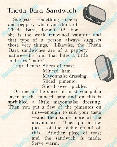 So, we can see very little of Bara’s work but let’s taste the sandwich that she inspired. In 1916, Photoplay magazine published a collection of sandwich recipes that were said to be based on the screen personalities of the biggest female stars. What will Theda Bara’s recipe taste like?