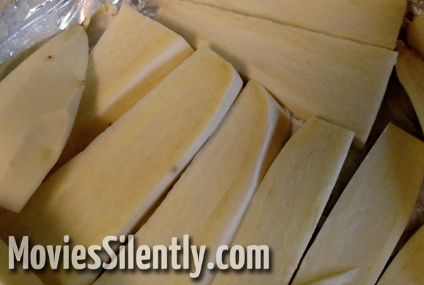 I started by layering them in a pan. I lined it with foil ahead of time because these things can make cleanup a pain. My pan was relatively shallow so I ended up with three layers of potatoes, which I had cut lengthwise into 1/3″ planks. I used butter softened at room temperature for easy spreading and to assure even coverage.