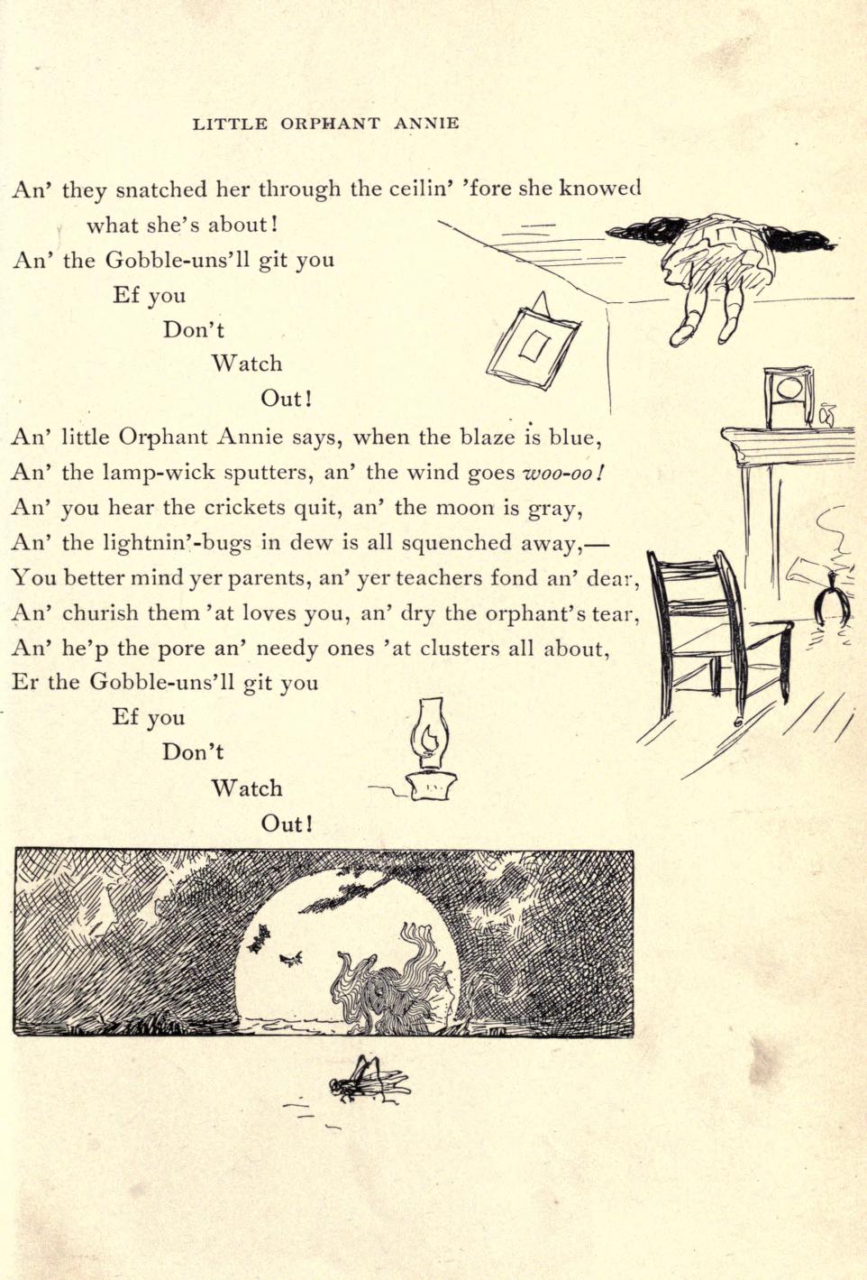 By the way, since someone is bound to bring it up, my understanding is that Riley’s poem inspired the title of Harold Gray’s iconic comic strip, the main difference being that Gray knew how to spell “orphan”. However, the poem and the comic have very little in common other than featuring an orphan named Annie.