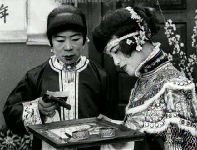 The Curse of Quon Gwon tells the story of a Chinese-American couple who run into a culture clash with their far more traditional family. Violet Wong, Marion Wong’s sister-in-law and dear friend, plays the very American bride (most of the cast was comprised of Wong’s relatives) who must adopt the old ways to please her husband’s family. Marion Wong plays one of the husband’s family members (the exact nature of their relationship is obscured by the lack of title cards) and she sets about scheming against Violet. The film shows the trials and tribulations of Violet before Marion’s machinations are uncovered and she stabs herself, the actual bloodletting hidden by a tasteful fadeout.