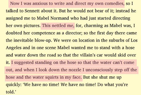 It’s odd that even people who agree that Chaplin’s memoirs are not to be trusted still parrot this version of the story. Some retellings of the tale have Normand in tears. Chaplin does not mention this in his memoirs. Other retellings say that Normand “snapped” at Chaplin. He does not mention this either. Other biographers claim that Chaplin’s power play against Normand had nothing to do with gender and he just wanted creative control. Chaplin contradicts this by emphatically stating that he objected to being ordered around by a “girl”. Stop painting the lily and stop making stuff up, Chaplin biographers, please and thank you.