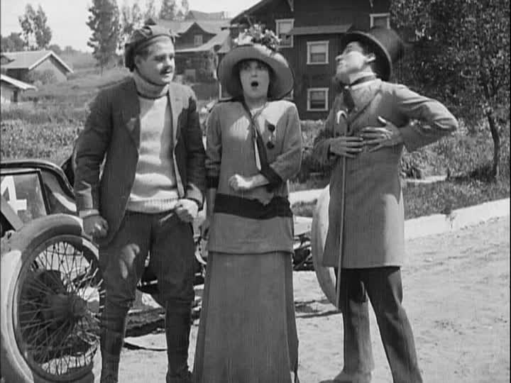 The plot is pretty standard fare for a comedy. Mabel Normand plays a woman with a wacky dad (Chester Conklin) and a racecar driver boyfriend (Harry McCoy). After she has a tiff with Harry, Mabel decides to take a ride with a local cad (Charlie Chaplin) on his motorcycle. The flirtation is short-lived as Charlie rides through a puddle and accidentally drops Mabel in the mud. Enraged that Mabel has gotten back together with Harry, Charlie arms himself with a straight pin and puncture’s Harry’s tire. Mabel and Harry respond by pelting him with bricks.
