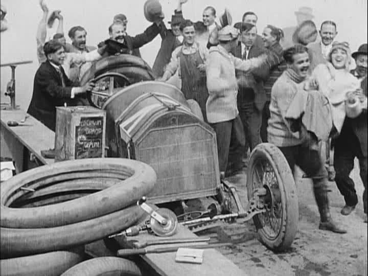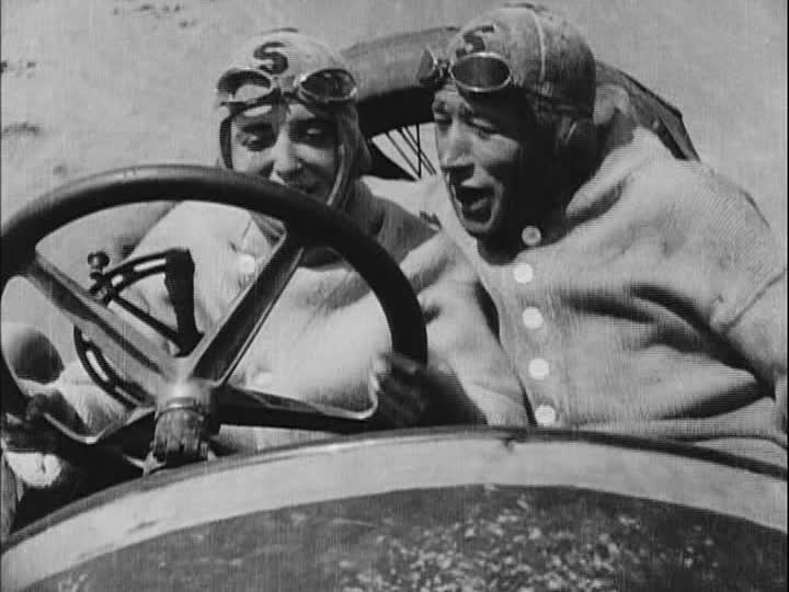 The day of the big race arrives (filmed, as many Sennett comedies were, at an actual event) and Charlie is plotting revenge. Thwarted in the use of his trusty pin, Charlie summons his goons and kidnaps Harry. With the driver securely tied up in a shed, he attempts to grab Mabel as well but she bites his hand and escapes. The race is starting and Harry’s car has no one to drive it! It’s time for Mabel to take the wheel but Charlie is not ready to give up. He throws smoke bombs and hoses down the racetrack so that the cars skid and spin. Will Mabel survive his machinations and win the day?