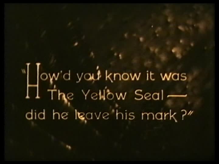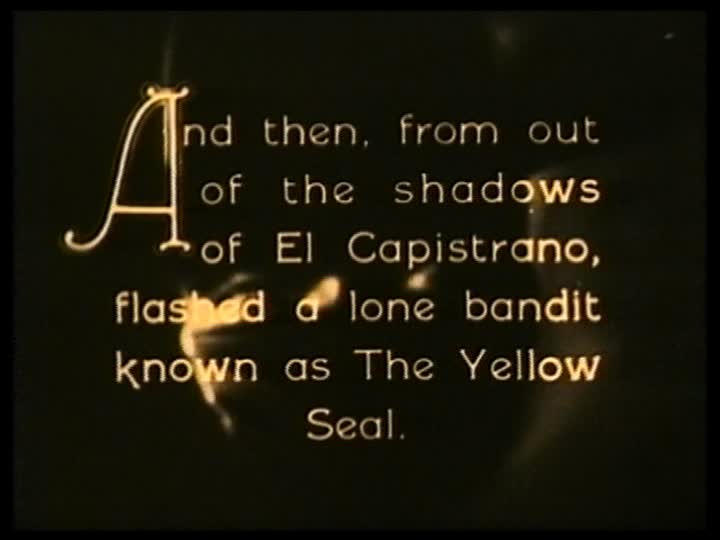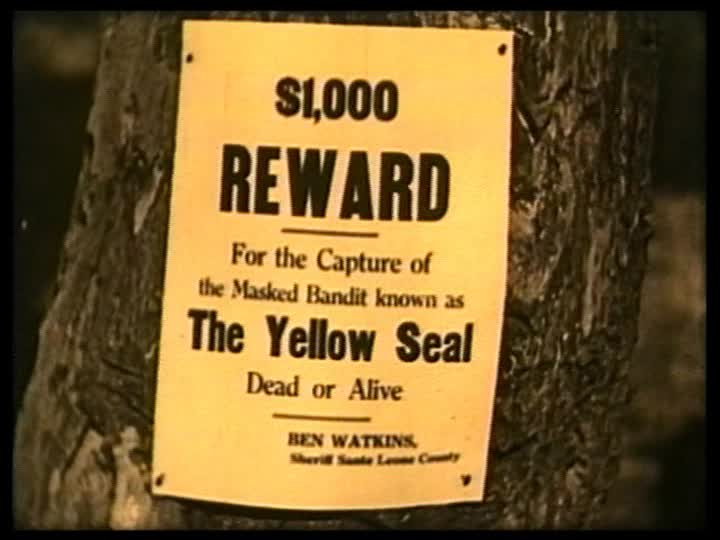 Some time passes and title cards inform us that a new bandit is flashing in El Capistrano. (Stop giggling, you!) It’s Brian, dressed all in black and sporting a mask. Because he dresses in black, he is known as the Yellow Seal (hey, I didn’t write it) and there is a hefty price on his head. And then there are a bunch of title cards about the Yellow Seal “leaving his mark” that I find hysterical because I am four.