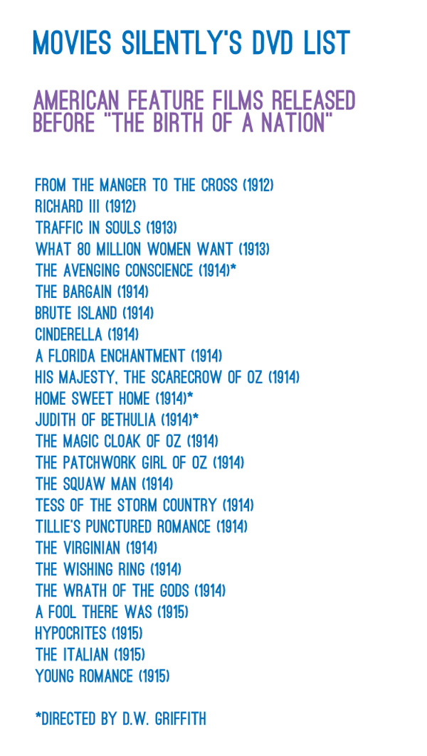 For your convenience, here is a list of American feature films released before Birth AND available on DVD. Considering that up to 90% of all silent films are missing and presumed lost and only a small selection of the surviving films are available on home media, we can safely assume this is just a fraction of the American film industry’s feature output. (And some of these titles were directed by Griffith. Just sayin’.)