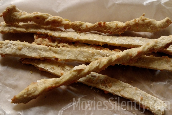 What went wrong? Well, let’s look at the ingredients. Florence is holding her cheese straws together with a measly half-cup of fairly low-fat cheese, water, and one egg yolk. Most cheese straw recipes I have seen use fattier cheese (often cheddar) and measure butter in sticks. Fat is not just about flavor, it’s about tenderness (and, in the case of pie crusts, staying firm under a liquidy filling).