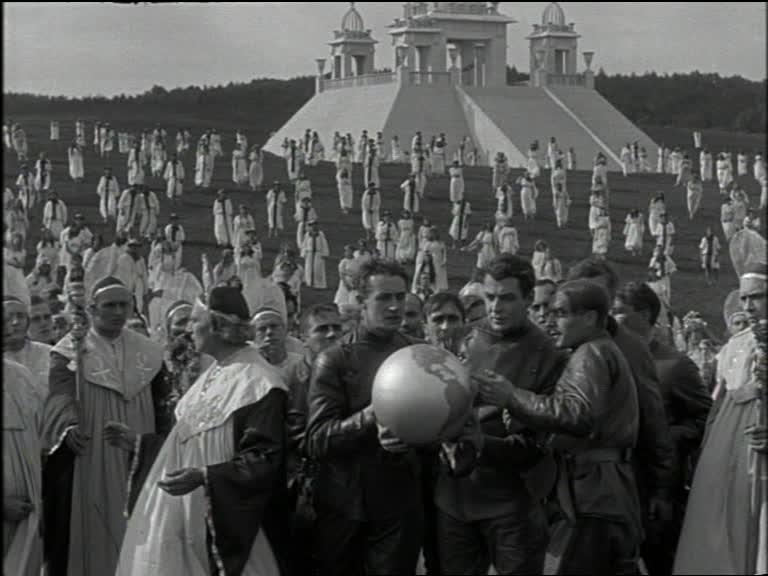 The performances are very… European, especially among the human characters. There was a tendency in European silent cinema to treat film acting as a series of poses, which leads to a choppy set of movements as the performers check items off the list. “Let’s see, I need to be excited then determined then indignant…” It’s not bad, it just takes some getting used to. In contrast, the Martians wander around with unfocused eyes and generally look stoned. However, I cannot blame the actors too much as they are called upon to play symbols rather than flesh and blood characters. When was that ever easy?