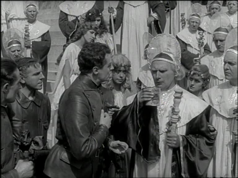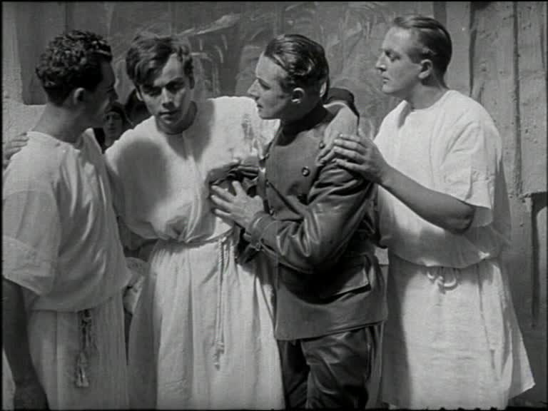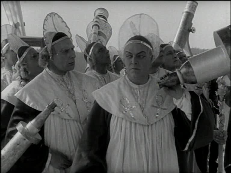The gunshot sends the crowd running to investigate, the rest of the Excelsior’s crew panics and they throw a grenade, which strikes and injures a very young Nils Asther. Tensions are high! What will become of the crew? As it turns out, they get a stern lecture about being nice, are told to say they are sorry and then given the robes of innocence, which gives their uniforms a rather Flash Gordon look.