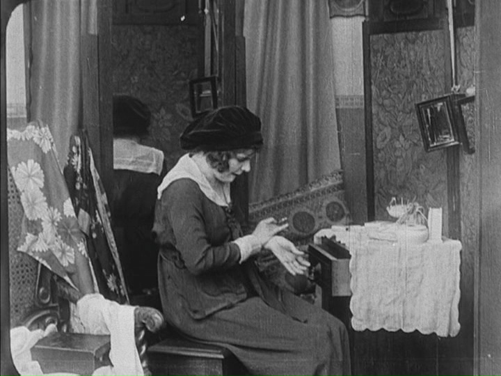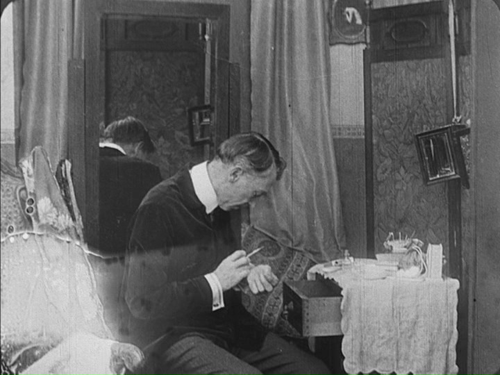 Minturn’s work is interrupted again by a visit from Patricia Devon (Marguerite Marsh, big sister of Mae), a naïve debutante who is quite taken with the artist herself. (Lordy! What cologne is Tully Marshall wearing? He needs to sell the formula to Axe!) Renee waits for the visit to end but then she slips out into the foyer. Her drug vendor has arrived with her supply. She pays him and slips away to shoot up. And, yes, they show everything, up to just before the needle piercing the skin.
