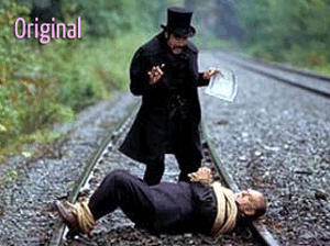 What’s worse than passing slapstick comedy stills off as dramas to prove that silent movies were all laughable melodramas? Photoshopping a still from a modern film to make it look like a silent movie, of course! Check out this little gem: