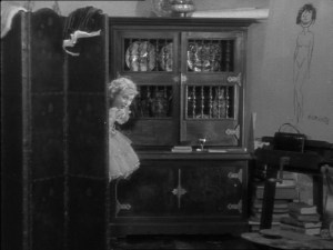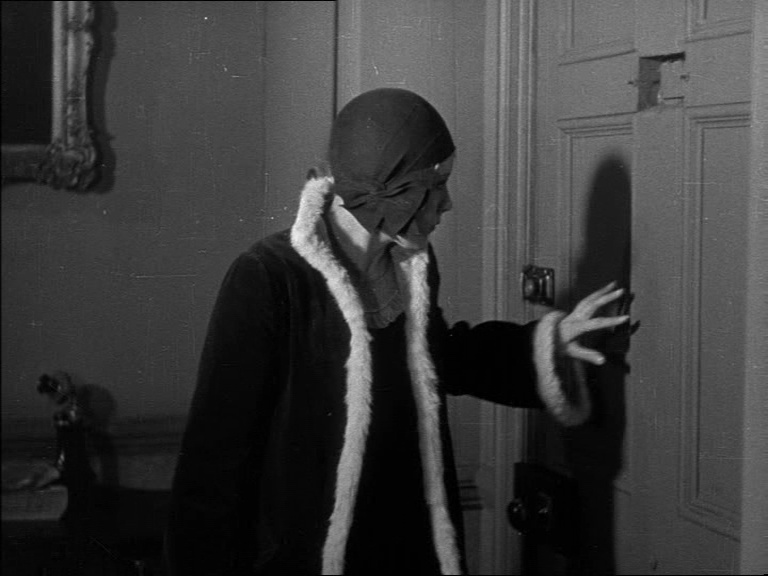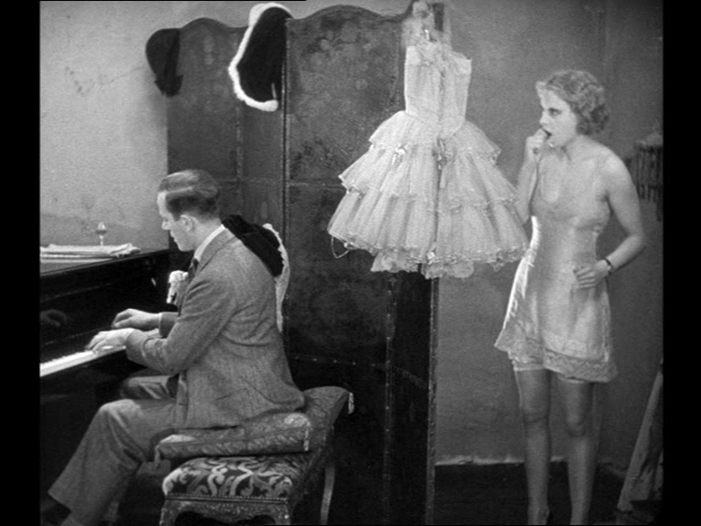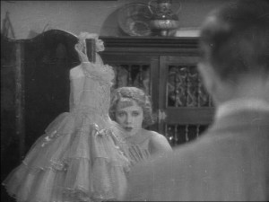 When Crewe takes the dress, the silent film includes one terse intertitle (“I’ve got it.”) before an over-the-shoulder shot of the artist approaching a terrified Alice. It’s tense and truly frightening. In the sound film, Crewe takes the dress and plays the piano until Alice notices that it’s missing. After he tosses it away, we are given a stagey shot of Crewe grabbing Alice. Not nearly as ominous.