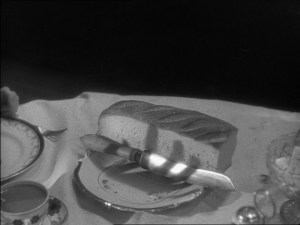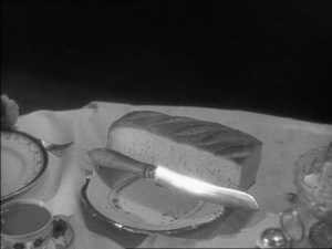 Crewe takes Alice’s dress, throws it out of reach and then grabs her and drags her to the bed. (Some reviews refer to this as a “seduction.” Yipes! I hate to think what they would consider an actual sexual assault.) The next part of the scene features the sort of suggested violence that viewers expect from a Hitchcock film. The bed is a four-poster canopy affair with the curtains hiding most of the struggle. Alice’s hand thrashes outward and lands on a bread knife sitting on the nightstand. Once again, the curtains tell the story and Alice’s frenzied stabbing is left to the imagination.