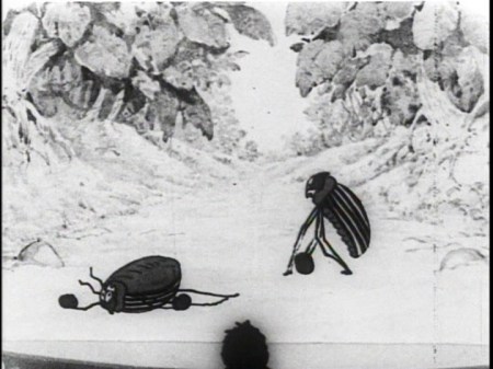 The insect performers in the film include a grasshopper juggling an ant, a dancing daddy long legs, a cockroach on a trick bicycle, acrobatic tumble bugs, boxing potato bugs, a butterfly riding a black beetle, and the final, fatal spider. If this sounds like a lot, it is. I was hard-pressed to remember the performers after seeing the cartoon and had to go back to my notes to be sure I wasn’t forgetting anyone.