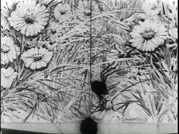 The insect performers in the film include a grasshopper juggling an ant, a dancing daddy long legs, a cockroach on a trick bicycle, acrobatic tumble bugs, boxing potato bugs, a butterfly riding a black beetle, and the final, fatal spider. If this sounds like a lot, it is. I was hard-pressed to remember the performers after seeing the cartoon and had to go back to my notes to be sure I wasn’t forgetting anyone.