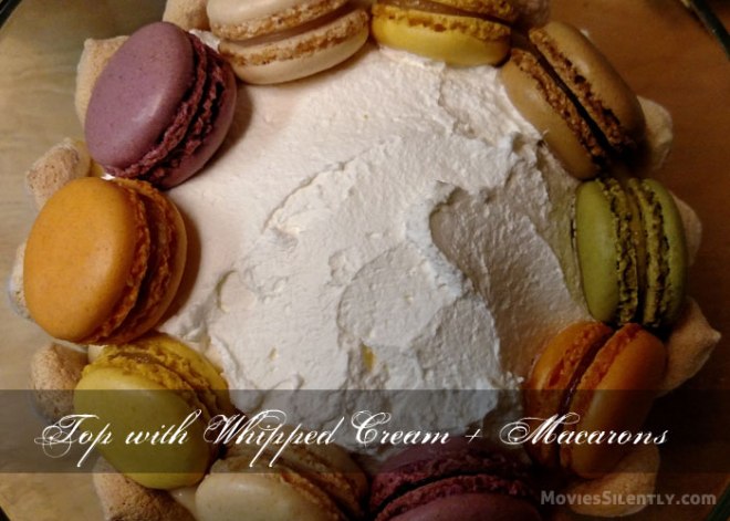 Anyway, I topped the thing with whipped cream (unsweetened as the whole thing had a lot of sugar already), which was not in the recipe but I added anyway, and the multi-colored/flavored macaroons. And now you see why this was such a funny thing to serve on Super Bowl. Have you ever seen anything more frilly?