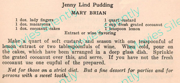 Three things struck me as odd: first, why was a twenty-three-year-old making a recipe named after Jenny Lind, the Swedish songbird who had toured the United States over a half-century before she was born? Second, why did theΒ recipe call for wine at the height of Prohibition? The other recipes in the cookbook are careful to shield themselves by calling for “flavoring” or near beer or merely hint at illegal additions. Third, the writing seems exceedingly stiff and formal, far more so than any other recipe in the book.