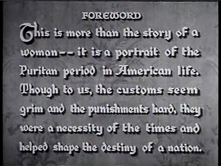 This change in movie mores is obvious from the very start. While the 1926 film opened with a title card condemning the stern, unforgiving nature of the puritans, this version of the tale has the audacity to open with a title card assuring us that the sadistic punishments meted out on the populace were necessary. However, this nonsense is undermined by a shot of man being placed in stocks for laughing on the Sabbath. Yeah, necessary punishment there.