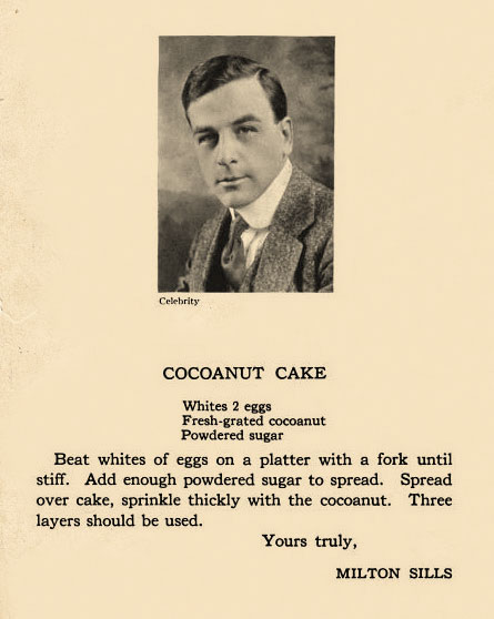 Ha! That recipe gave me a good laugh…..”Spread over cake. Sprinkle thickly with the coconut. Three layers should be used” What cake? Must be a silent one! Thank you for introducing me to Milton Sills. I’ll definitely be checking out his work. I want to say he reminds me of another actor….but I can’t think of who.